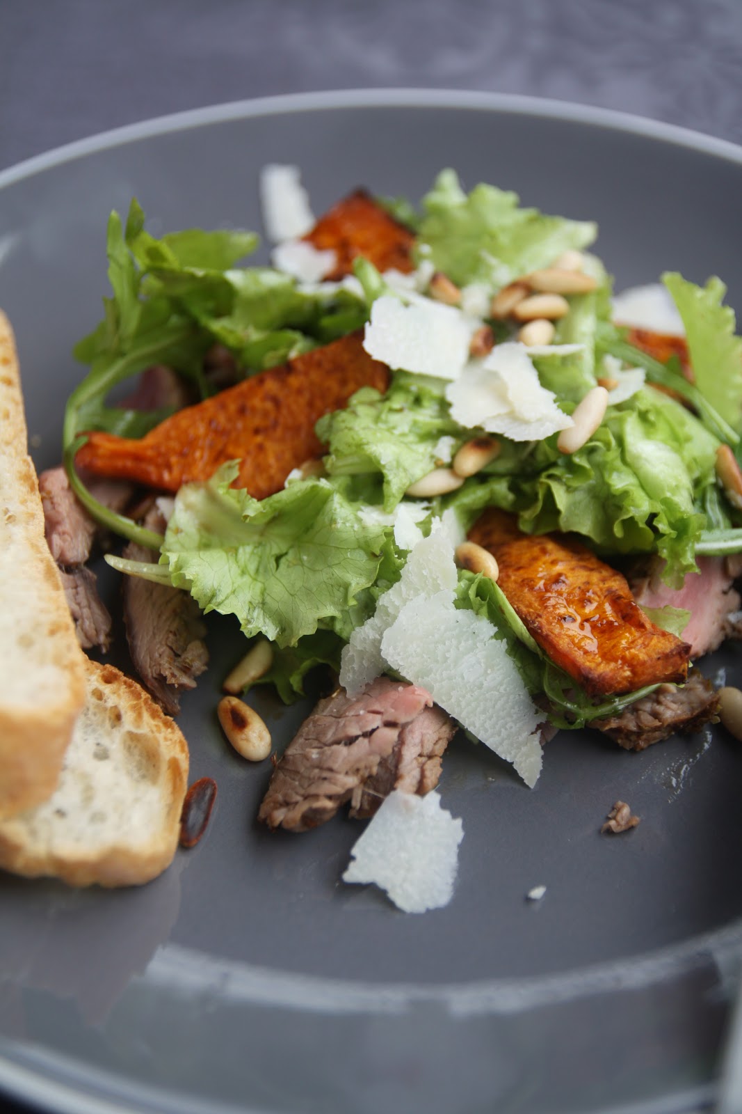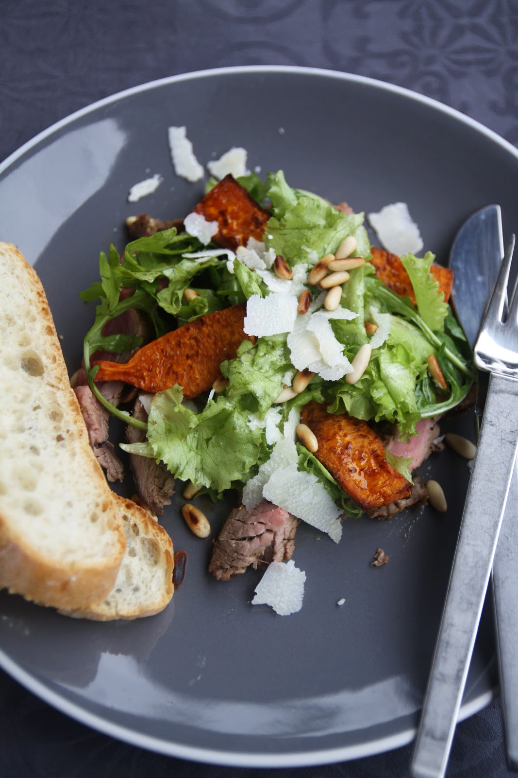 Ingredienti per 4 persone: 600gr di zucca Hokkaido, origano secco, 400gr di filetto di manzo, 20gr di burro, 40gr di nocciole (io ho usato i pinoli), 125gr d’insalata mista (rucola, lattughino, spinacino…), olio extravergine d’oliva, 1 cucchiaio di succo di limone, 1 cucchiaio di aceto di Xérès, 2 cucchiai di olio di nocciole (o d’oliva), 40gr di scaglie di parmigiano, fior di sale, pepe nero.