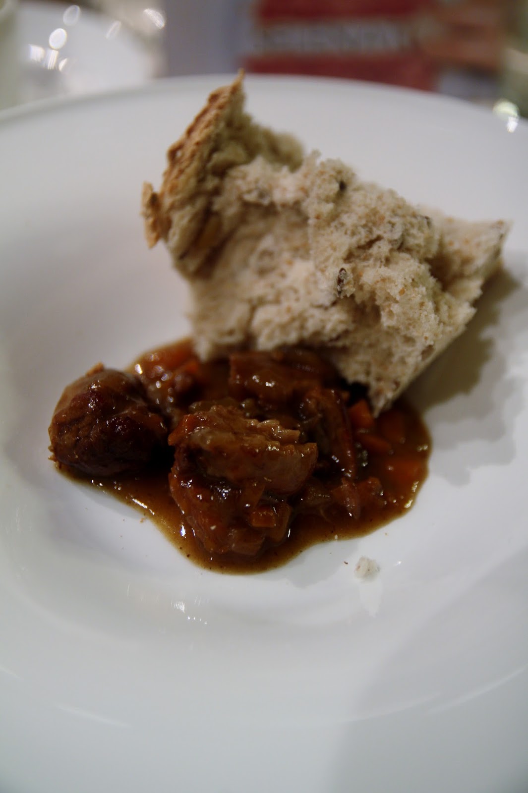 Intingolo d’anatra tagliata a punta di coltello con pane ai cereali croccante.