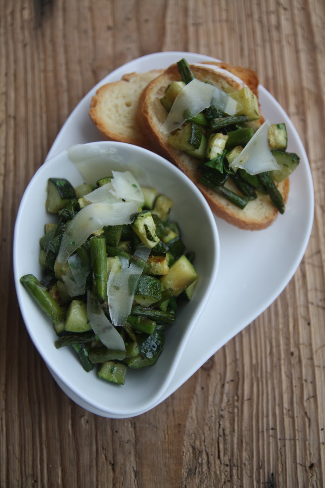 Eliminate l’estremità dura degli asparagi, lavateli e tagliateli a pezzi. Lavate le zucchine e tagliatele a dadi, poi mescolate le due verdure in una ciotola con l’olio, sale e pepe. Trasferite il tutto in una pirofila o nella teglia del forno e cuocete una ventina di minuti a 200°C, forno ventilato. Nel frattempo, tagliate a scaglie il pecorino (o il parmigiano) aiutandovi con un pelapatate e tritate prezzemolo e menta. Quando le verdure sono pronte, rimettetele nella ciotola, aggiungete le erbe aromatiche e mescolate delicatamente. Tostate il pane (alla stessa temperatura) e sfregolatevi poi l’aglio tagliato a metà, infine versatevi sopra un filo d’olio d’oliva. Disponete le verdure su ogni fetta di pane, aggiungete le scaglie di formaggio e servite subito.