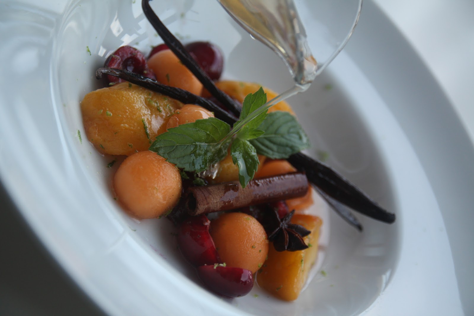 Ingredienti per 4 persone: 2 pesche, 1 melone, 6 fragole, 6 ciliegie, 20 g di burro, 50 g di miele, 2 chiodi di garofano, 2 bastoncini di cannella, 2 anici stellatie, 1 stecca di vaniglia, 15 foglie di menta, 1 lime.