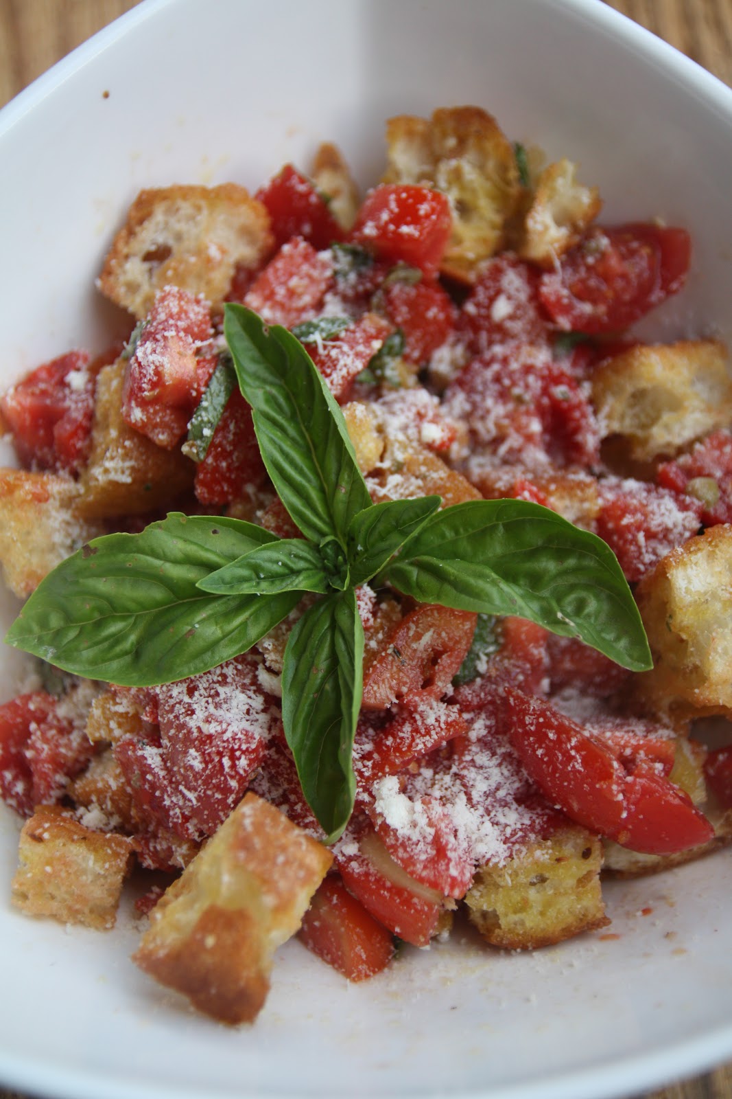 Tagliate la ciabatta a pezzi di 2 cm, metteteli in una pirofila, annaffiateli d’olio d’oliva e mescolateli con i semi di finocchio, l’origano (o il rosmarino) e un pizzico di sale. Mescolate bene, poi infornate a 200°C (o sotto il grill) per 10 minuti o finché il pane sarà dorato. Nel frattempo, tritate grossolanamente e mescolate capperi e acciughe, la maggior parte delle foglie di basilico e 4 peperoni. Schiacciatevi sopra l’aglio in camicia e trasferite il tutto in un’insalatiera, aggiungete poi i pomodori tagliati a pezzi. Condite con l’aceto, l’olio, sale e pepe. Aggiungete il pane tostato, poi i 2 peperoni rimasti tagliati con le mani e schiacciate il tutto con le mani (personalmente ho usato cucchiaio e forchetta!!). Spolverate con il parmigiano grattugiato e le foglie di basilico rimanenti.