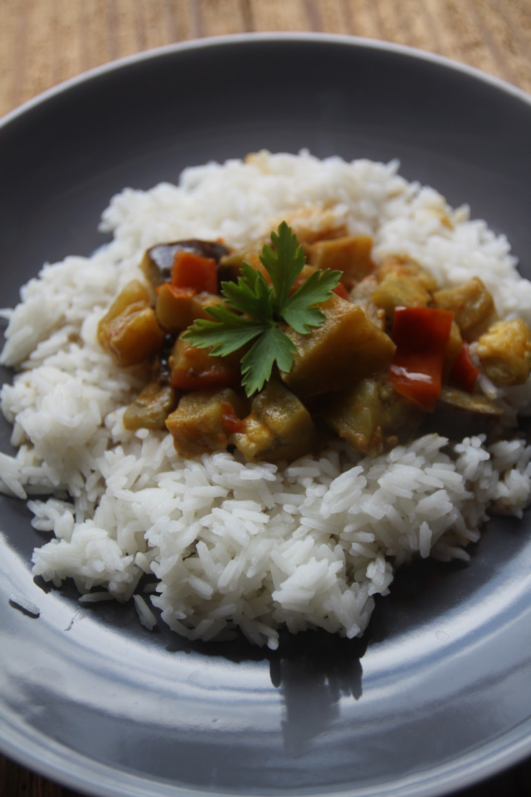 Scaldate l’olio in una padella capiente, aggiungete i semi di senape e, dopo 2 minuti, le foglie di curry, i pomodori e la curcuma, cuocete mescolando. Aggiungete poi le melanzane, mescolate e cuocete con un coperchio finché si saranno ammorbidite. Aggiungete quindi il garam masala, il pepe, il latte di cocco e 125ml d’acqua. Portate a bollore, poi abbassate la fiamma e cuocete per circa 20 minuti. Spolverate con il fieno greco e servite con del riso basmati.