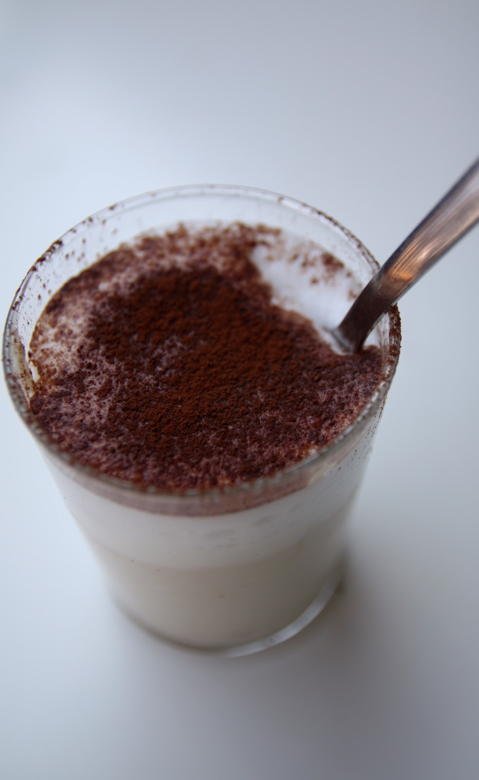 Ingredienti per 4 persone: 400gr di mascarpone, 80gr di zucchero a velo, 4 cucchiai di caffè espresso, 100gr di yogurt bianco cremoso, 200ml di latte, cacao amaro in polvere.