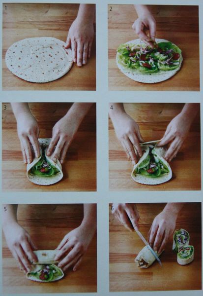 Spalmate la crema al curry sui chapati, ricoprite con gli spinacini, poi disponete il pollo e il peperone. Arrotolate il wrap come indicato sulla foto e servite!