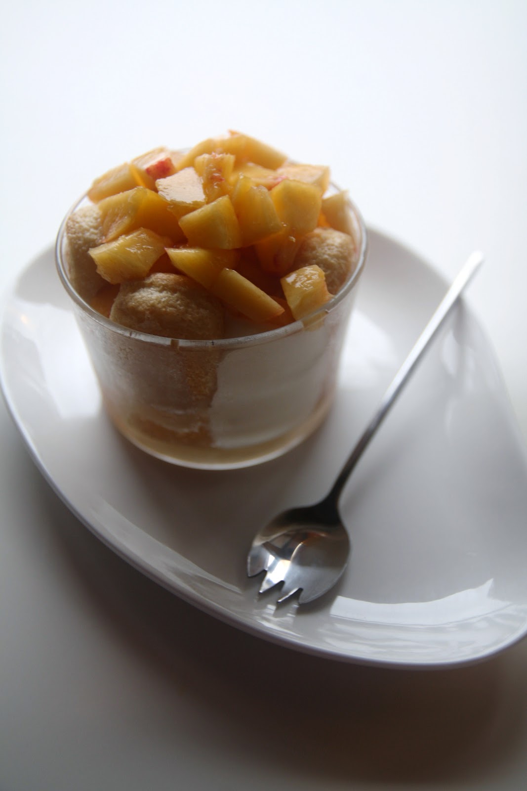 Preparate lo sciroppo, scaldando l’acqua e il condimento al mango in un pentolino. Aggiungete lo zucchero di canna, cuocete 5 minuti a fuoco basso, poi spegnete. Aggiungete la stecca di vaniglia tagliata a metà nel senso della lunghezza e il rum, poi lasciate raffreddare a temperatura ambiente. Pelate le pesche e tagliatele a pezzetti. Preparate la crema, separando tuorli e albumi. Montate i tuorli con lo zucchero a velo fino ad ottenere un composto chiaro e spumoso. Aggiungete il mascarpone e amalgamatelo bene. Montate gli albumi a neve e incorporateli delicatamente alla crema. Inzuppate i savoiardi nello sciroppo e sistemateli nei bicchieri, in verticale. Versate la crema nel centro, ricoprite con i pezzi di pesca e lo sciroppo rimanente. Mettete in frigo per 20 minuti e servite.