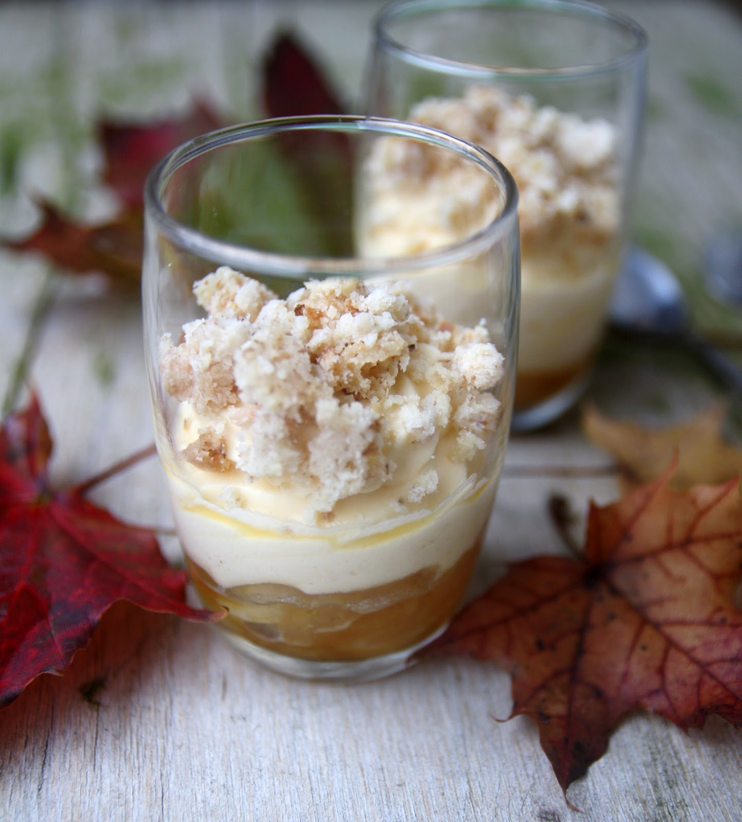 Un goloso dessert al cucchiaio con diverse consistenze: le pere caramellate, una morbida crema al mascarpone e un croccante crumble alle noci.
