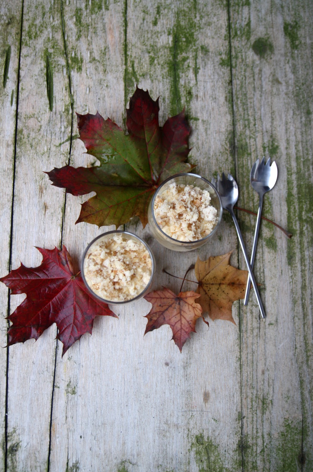 Mentre il dessert riposa in frigorifero, preparate il crumble di noci mescolando tutti gli ingredienti e lavorandoli con le dita: dovrete ottenere un composto sbriciolato. Versatelo sulla teglia del forno ricoperta di carta forno e cuocete 20 minuti a 160°C. Lasciatelo raffreddare prima di trasferirlo in un contenitore a chiusura ermetica. Prima di servire, sbriciolate il crumble nei bicchieri.
