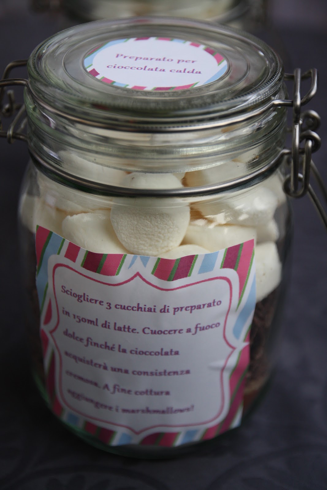 Potete mescolare tutti gli ingredienti oppure metterli a strati nel vasetto per ottenere un effetto ottico più carino. Aggiungete i marshmallow (io li ho tagliati a metà) direttamente nel vasetto. Unite un’etichetta con le istruzioni per l’uso: