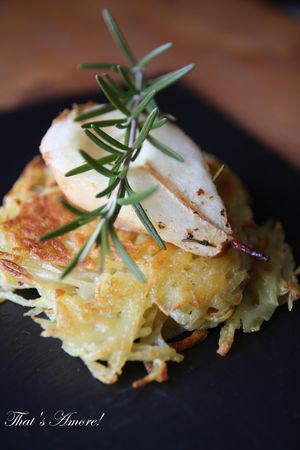 Tagliate la pera sbucciata in due, togliete la parte centrale e cospargete di limone. Mettete le 2 metà in una pirofila imburrata. Aggiungete qualche foglietta di rosmarino e il burro rimanente. Cuocete circa 20 minuti girandole ogni tanto e bagnandole spesso. Devono essere dorate e tenere. In una padella, cuocete nell’olio e in 15gr di burro 4 tortine di patate sottili per circa 25 minuti.