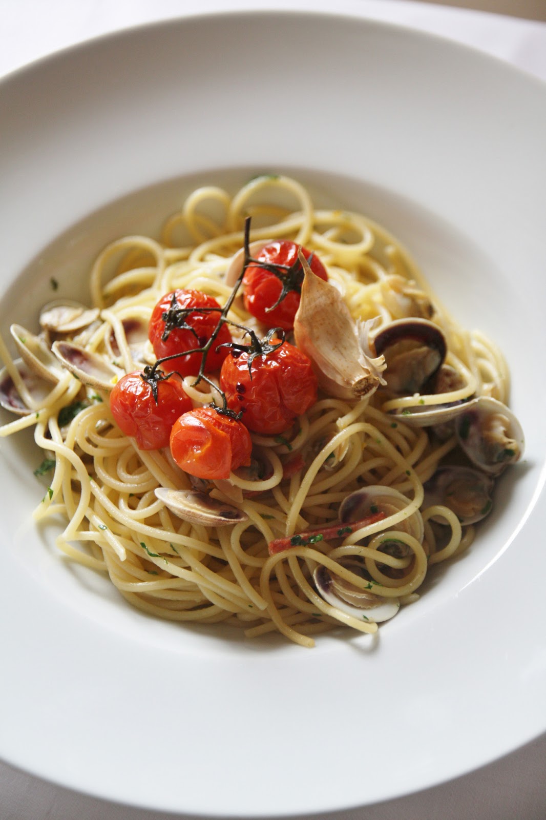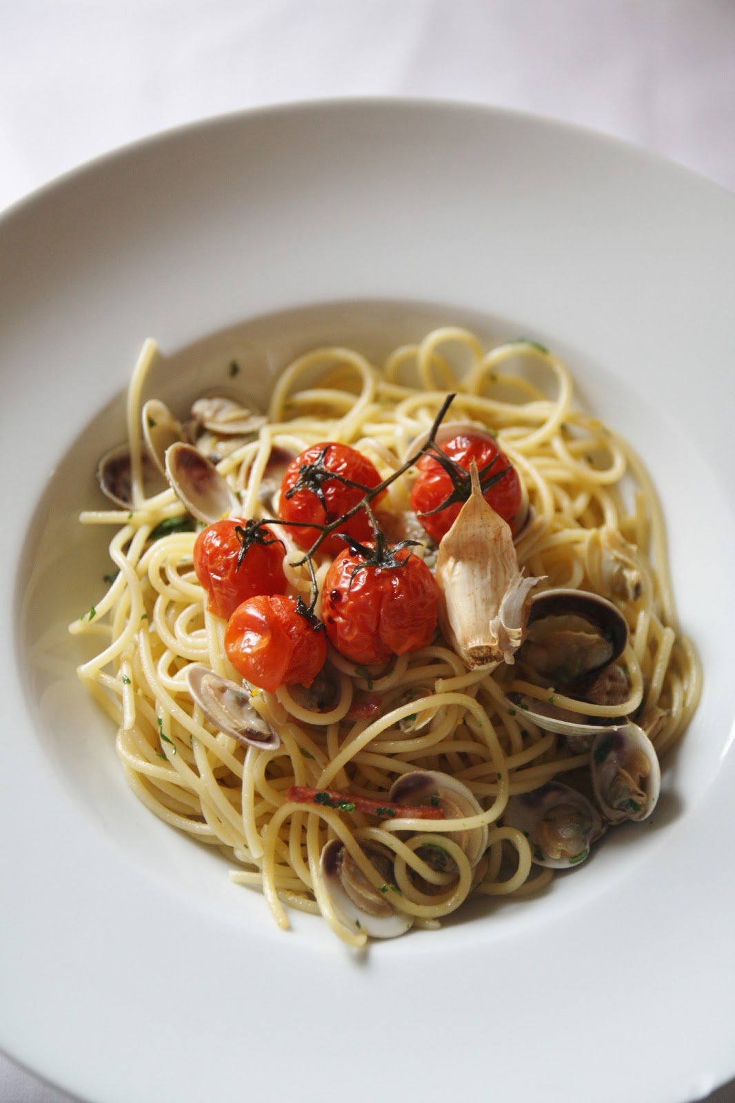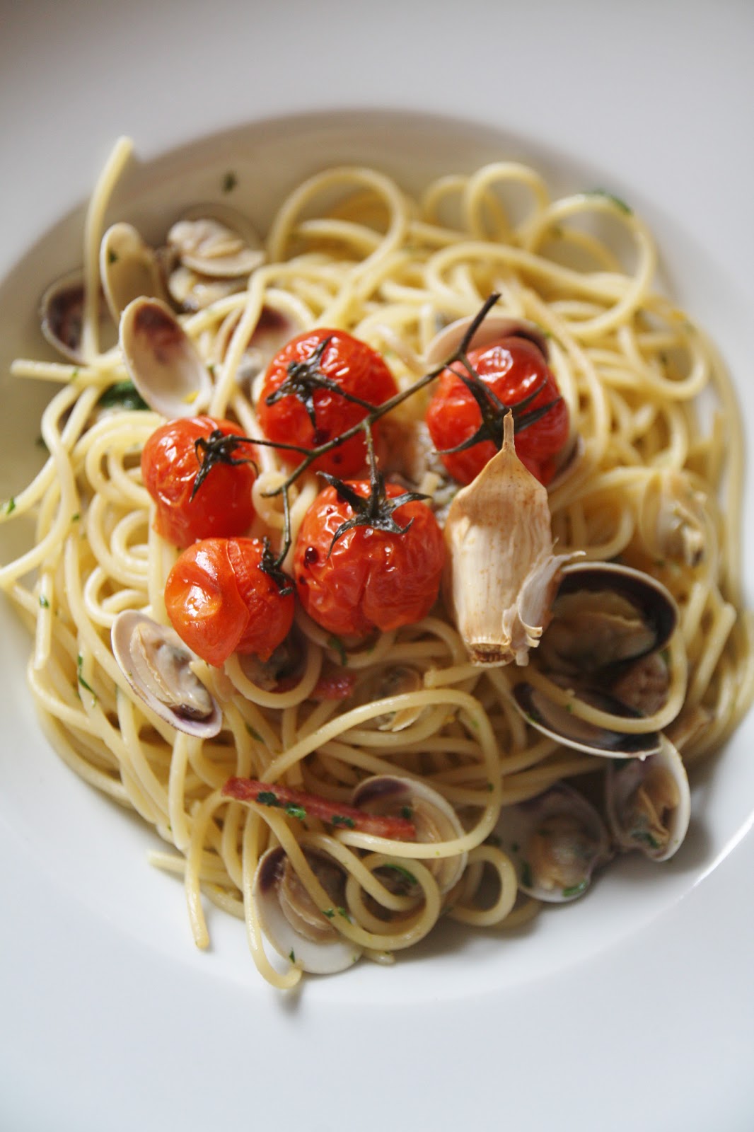 Ingredienti per 4 persone: 360gr di spaghetti, 40 vongole, 4 grappoli di pomodorini ciliegia, 1 testa d’aglio, vino bianco, 1 limone, 1 lime, 1 arancia, 50gr di chorizo, 2 rametti di timo, 4 foglie di alloro, 1 mazzetto di prezzemolo, 1/2 mazzo di erba cipollina, 1/2 mazzo di basilico, 3/4 cucchiai di aceto balsamico, olio d’oliva, sale, fior di sale, sale grosso.