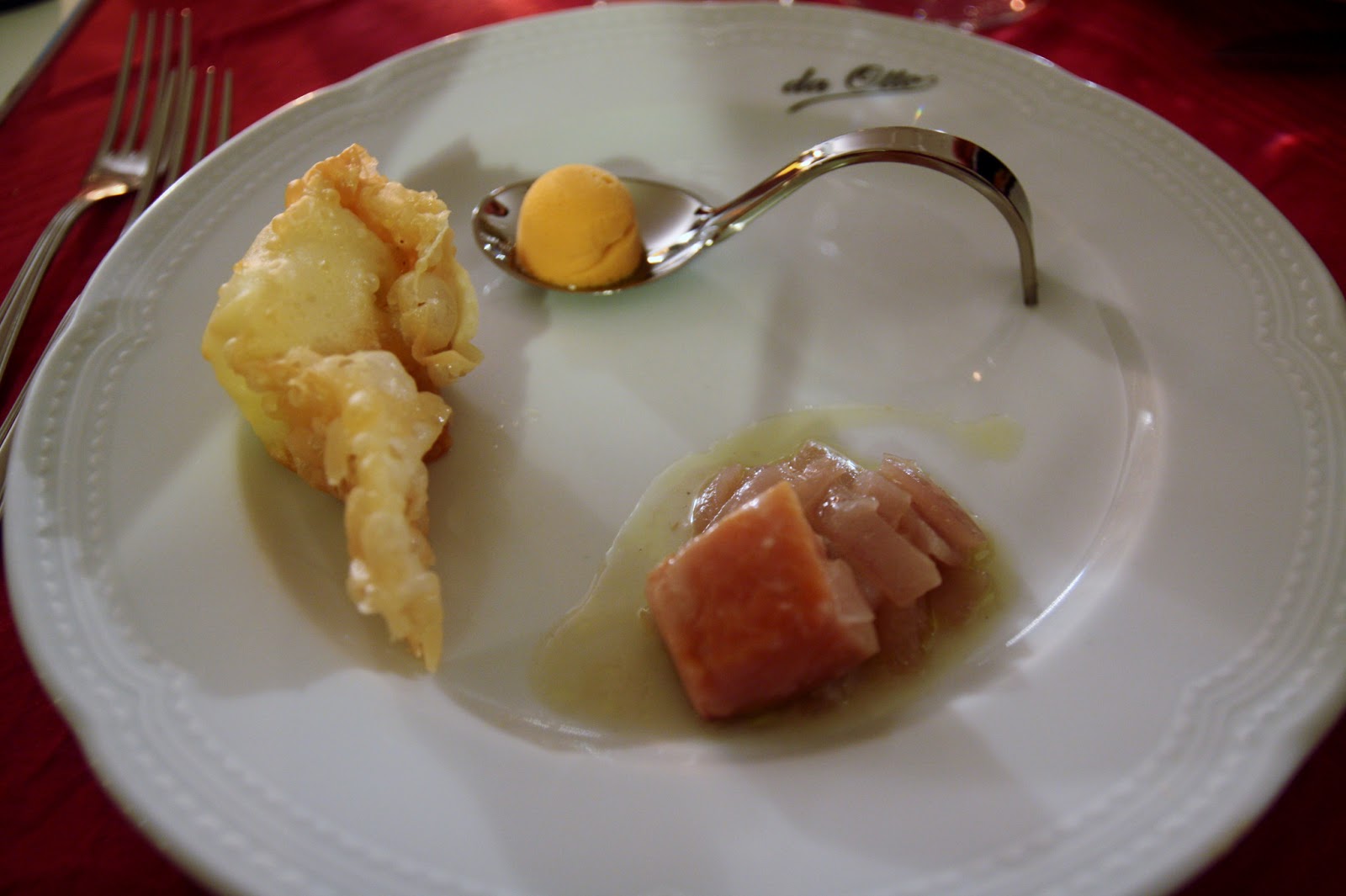 Partendo dalla sinistra, frico fritto in pasta fillo con asparagi, croccante e fondente, una vera delizia! Accompagnato dal gelato al peperone, fresco e dal gusto delicato mi è piaciuto tantissimo. Infine, la trota Regina di San Daniele in saor di cipolle rosse della valle d’Incaroio: un gusto delicato che si sposava bene con le cipolle, non predominanti come si potrebbe pensare.