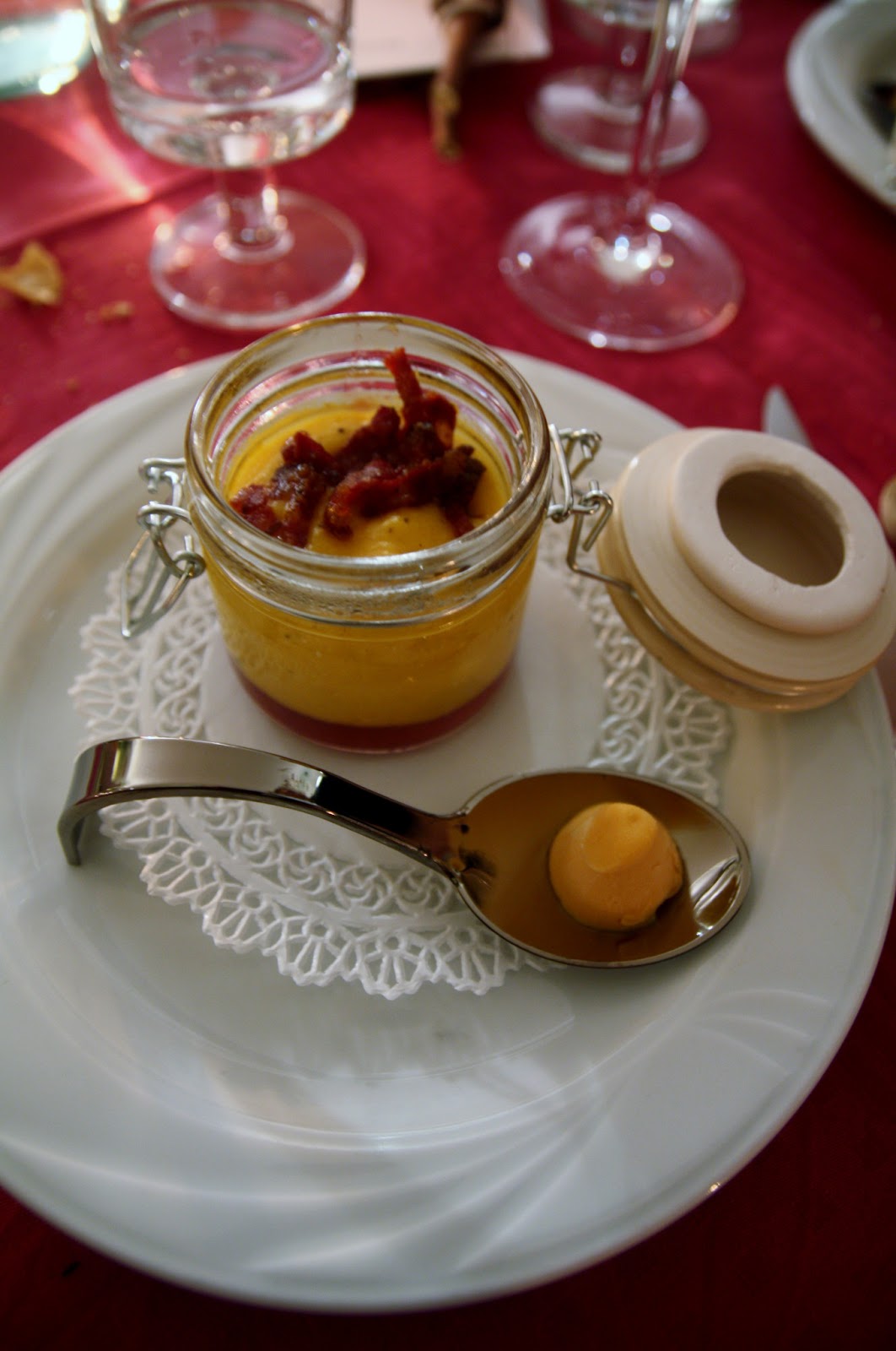 A seguire zuf di zucca con composta di melograno e pitina di cervo alla paprica, con gelato al peperone: una vera scoperta! Lo zuf delicato e cremoso, la composta dolce e la pitina croccante: un’esplosione di sapori! Lo zuf o suf è una crema di farine di grano e mais condita con burro, cotta come una polenta e servita semiliquida con un po’ di latte. La pitina è una polpetta di carne affumicata tipica della Val Tremontina, in provincia di Pordenone, passata nella farina di mais prima di essere affumicata.