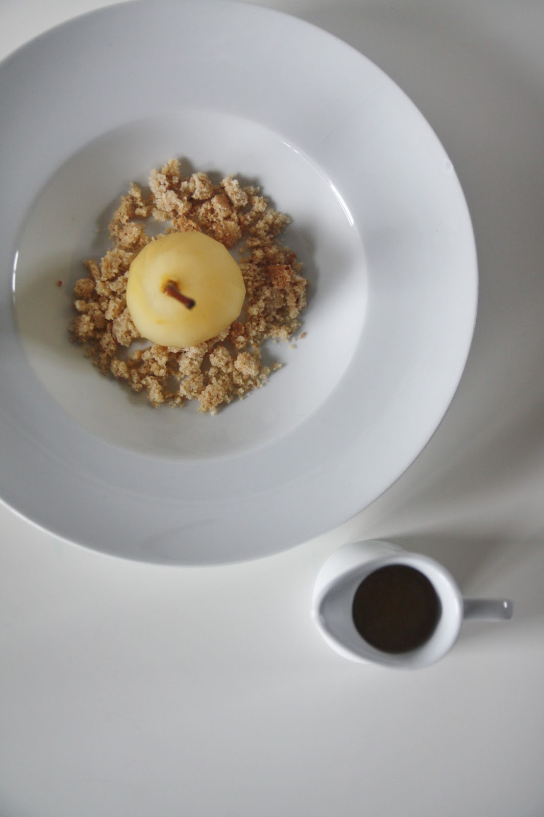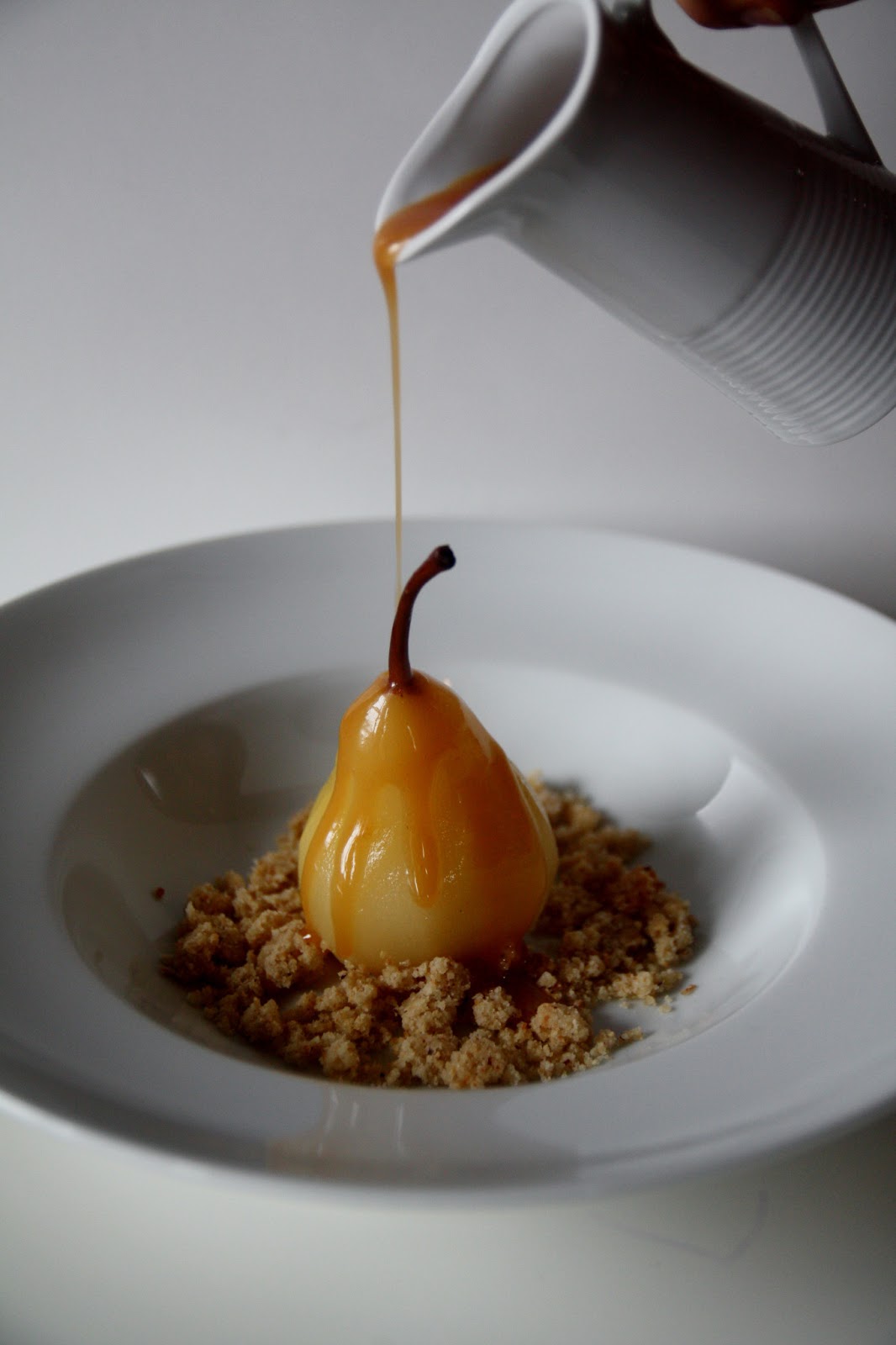 Prima di servire, farcite le pere con le mele cotte. Sbriciolate il crumble sul fondo dei piatti, sistematevi sopra una pera e versatevi la salsa al caramello calda…