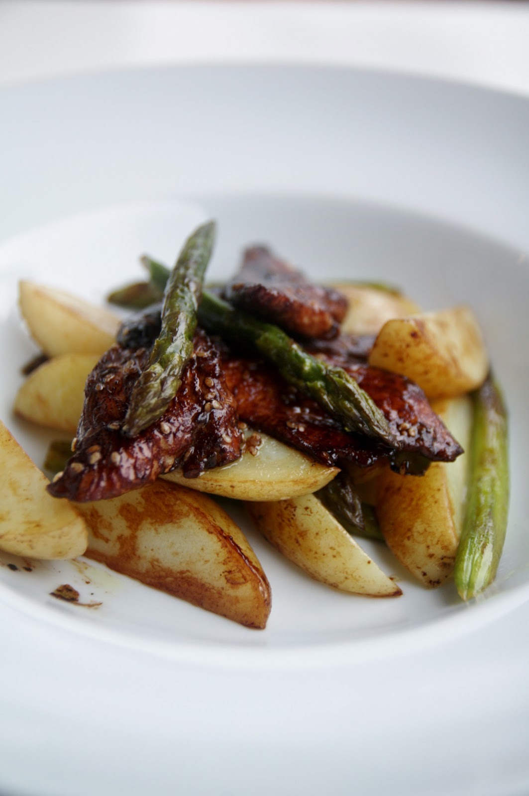 Ingredienti per 4 persone: 600 g di petto di pollo, 20 ml di salsa di soia, 1 cucchiaio di miele d’acacia, 1 spicchio d’aglio, 8 patate novelle medio/piccole, 1 mazzo di asparagi, semi di sesamo, olio di arachide, sale.