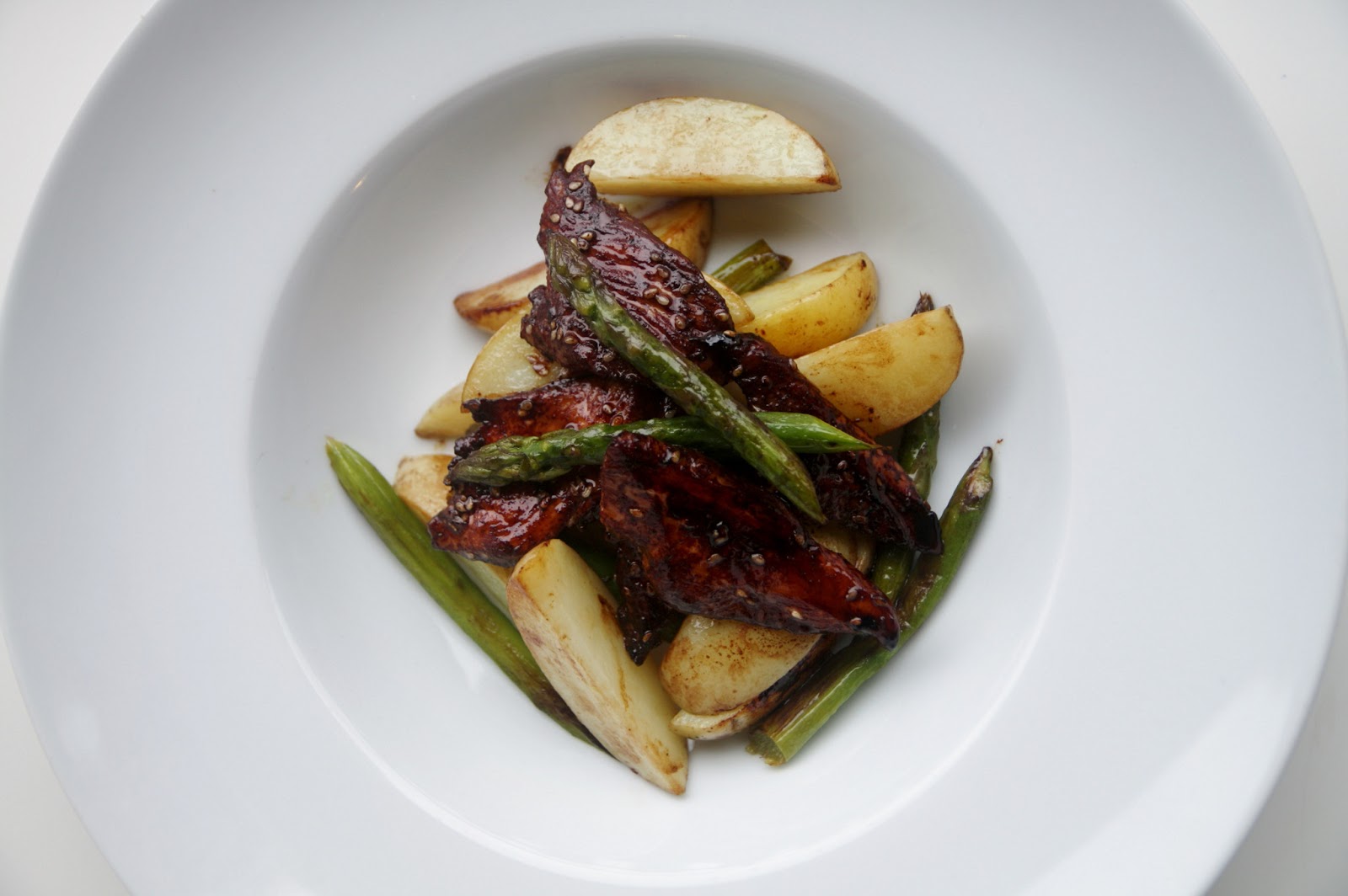 Quando ho ricevuto l’ultimo numero di Sale & Pepe, questa ricetta mi è piaciuta subito! La marinatura nella salsa di soia rende il pollo morbido e profumato. Nella ricetta originale, assieme agli asparagi, c’era una melanzana violetta ma in casa avevo le patate così ho usato quelle! Potete usare anche carote, zucchine, broccoli… insomma, qualsiasi tipo di verdura.