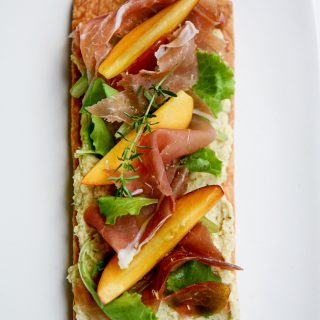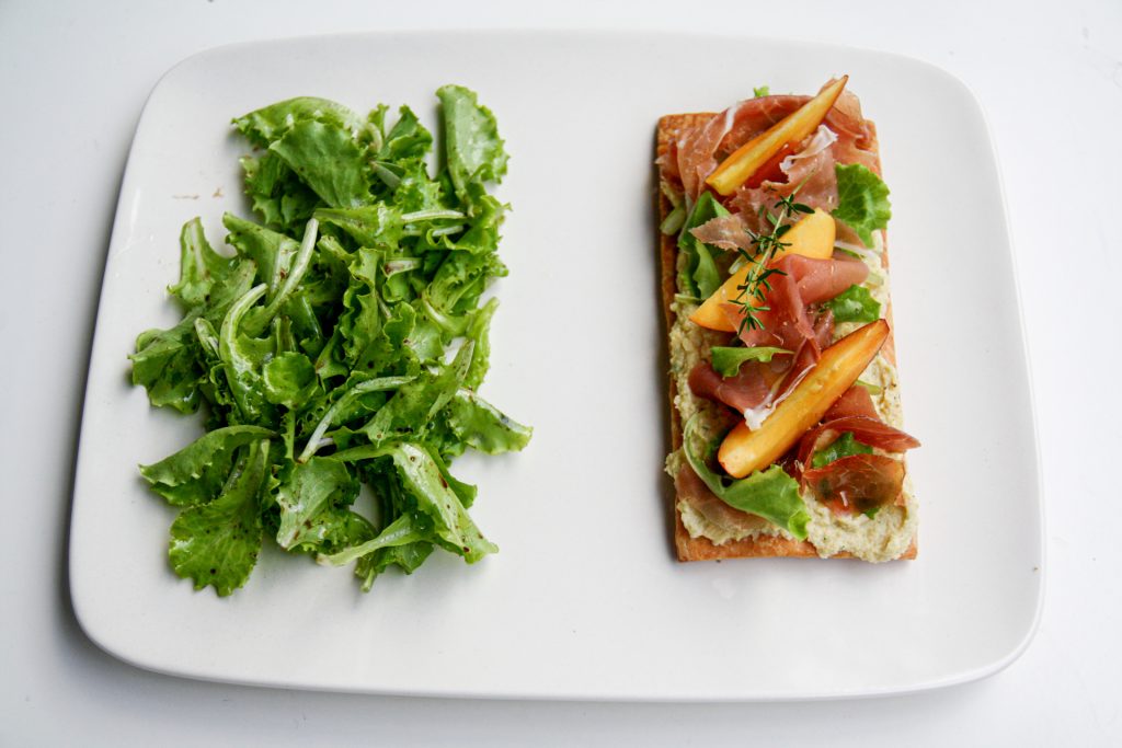 - Spalmate la crema sulle tartellette fredde, disponete il prosciutto crudo, l’insalatina, le pesche tagliati a spicchi, un filo d’olio e del pepe macinato.