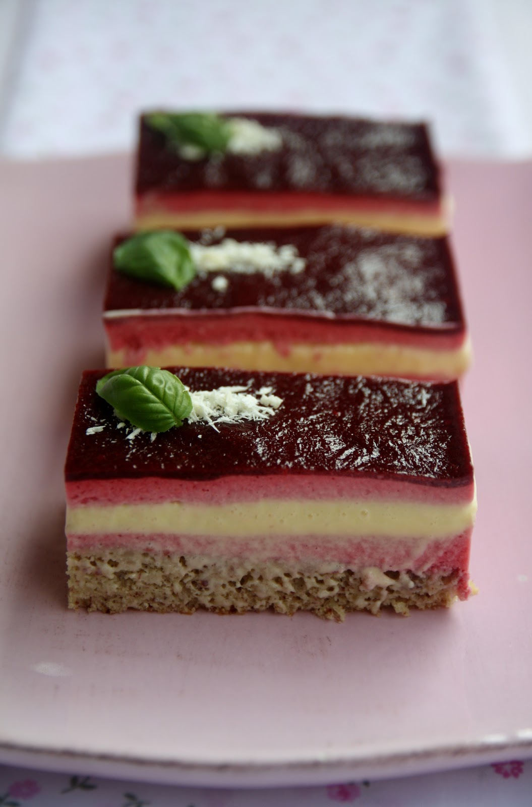 Buono a sapersi: per la mousse ai lamponi, se realizzate i 2 strati per ottenere l’effetto visivo rosa-bianco-rosa, montate tutta la panna, conservatene la metà in frigo fino al momento di realizzare il secondo strato di mousse. Per ottenere la purea di lamponi, frullate i lamponi freschi e setacciali. Calcolate un po’ più di lamponi che la dose richiesta nella ricetta. Se possibile, lasciate il basilico in infusione a freddo, per qualche ora in frigo. Ho usato uno stampo senza fondo, di forma rettangolare 23.6×16.2cm.