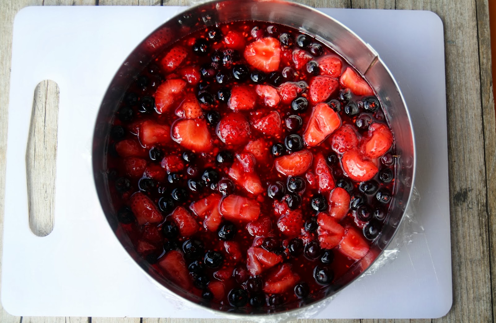 Buono a sapersi: la bavarese è molto liquida, vi consiglio fortemente di ben coprire il fondo del cerchio con della pellicola alimentare e di metterci un peso sopra, per evitare che non fuoriesca. Oppure, potete usate uno stampo con fondo amovibile (o in silicone) evitandovi questo problema.