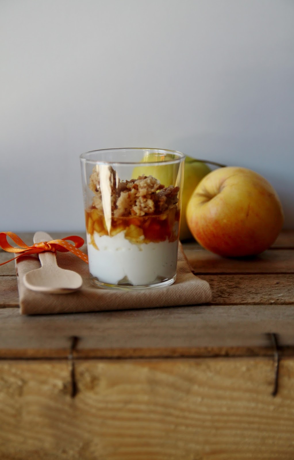 L’autunno è alle porte e, non so voi, ma io comincio a sentire il bisogno di comfort food, soprattutto per finire il pasto!! Oggi vi propongo di tuffare il cucchiaino in questo bicchiere, per scoprire uno yogurt greco fresco e morbido, delle mele caramellate calde e profumate di cannella, per finire con un crumble croccante alle noci e chips di mela…