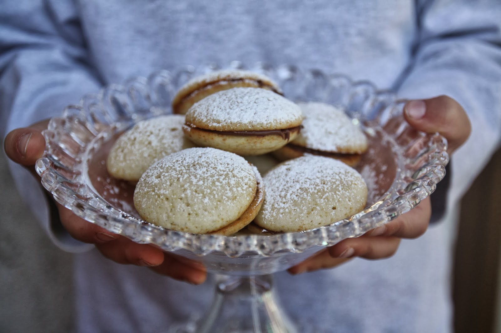 Ingredienti per una ventina di whoopies: 250gr di farina per dolci, 1 cucchiaino e mezzo di lievito per dolci, 100ml di latte, 100gr di burro ammorbidito, 125gr di zucchero, 1 uovo, 1 cucchiaio di panna da cucina, un pizzico di sale, Nocciolata Rigoni di Asiago.