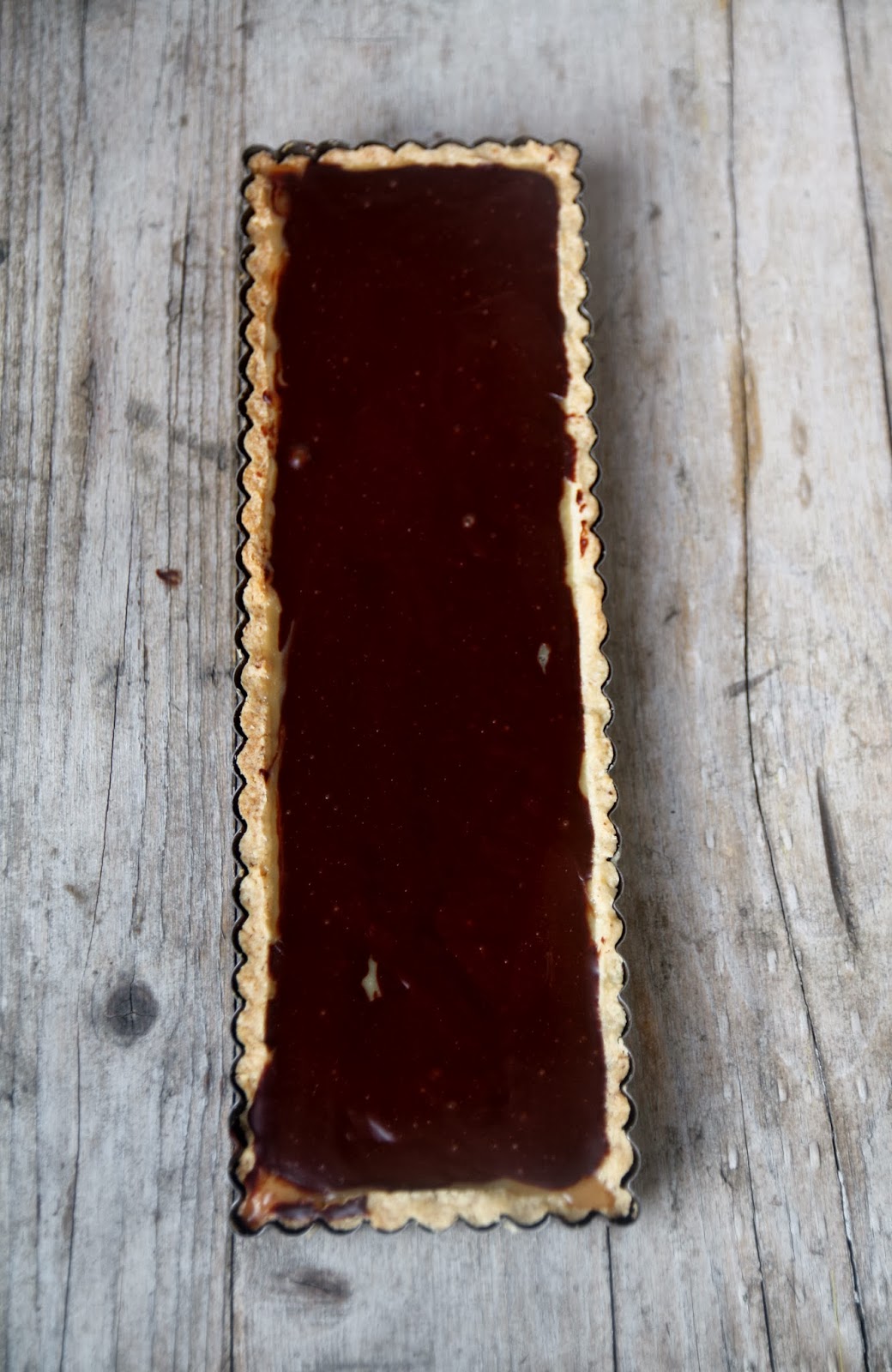 Tagliate il cioccolato a pezzetti. Portate quasi a bollore la panna e versatela sul cioccolato. Mescolate con una frusta finché il cioccolato si sarà sciolto completamente. Lasciate intiepidire, poi versate sul caramello e mettete in frigo per una notte intera.