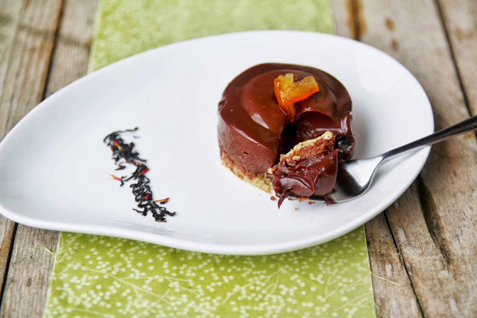 Ingredienti per il cremoso al cioccolato e tè: 70gr di panna, 70gr di latte intero, 9gr di tè Earl Grey, 35gr di zucchero, 45gr di tuorli, 1,5gr di gelatina alimentare (3/4 di un foglio), 150gr di cioccolato fondente, 15gr di scorze d’arancia candite + quelle per decorare.