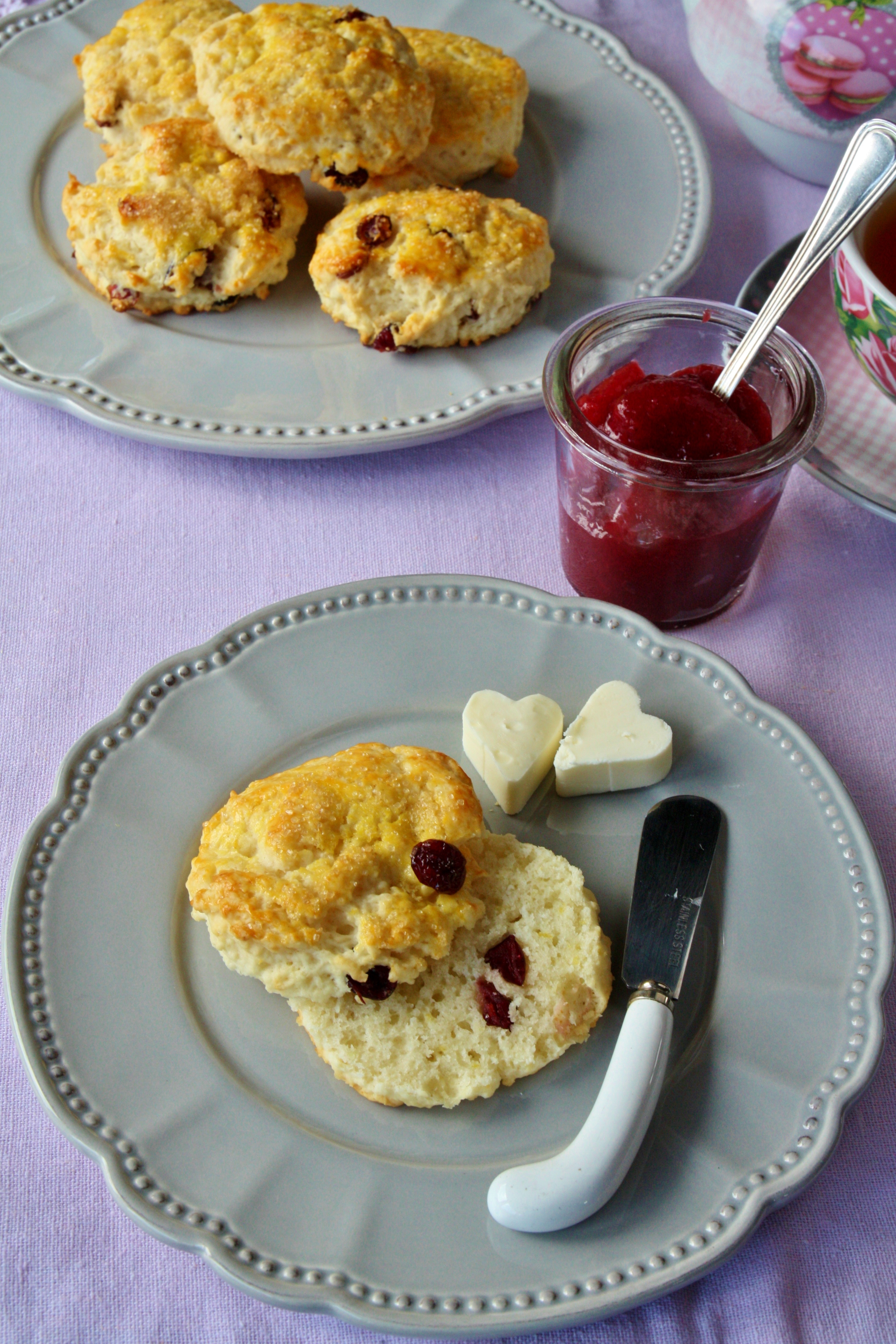 Ingredienti per una decina di scones: 350gr di farina, 18gr di lievito per dolci, 50gr di zucchero semolato, 360gr di panna da cucina, 75gr di cranberries secchi, la scorza di un limone, ½ cucchiaino di sale fino, 1 tuorlo, zucchero di canna qb.