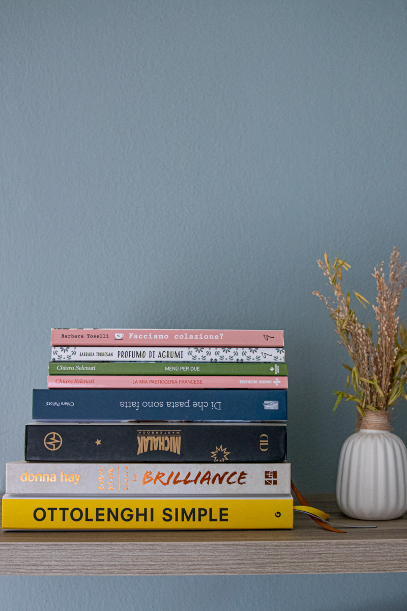 La mia biblioteca è molto cosmopolita: ci sono libri in italiano, in inglese e tanti in francese, ci sono moltissimi libri di pasticceria, ma non solo! C’è una sezione dedicata a Jamie Oliver (che adoro!) e, accanto, i libri delle cucine del mondo: cinese, indiana, spagnola, turca, scandinava… poi, uno scaffale dedicato agli aperitivi, antipasti, pane e panini; un altro più light e vegetariano e un altro ancora con manuali di cucina.
