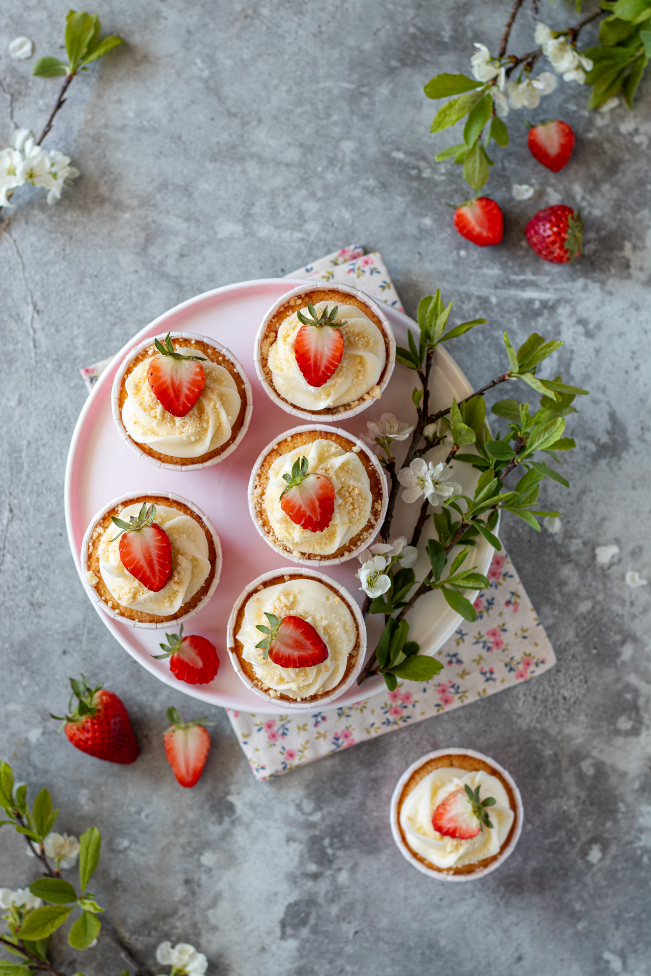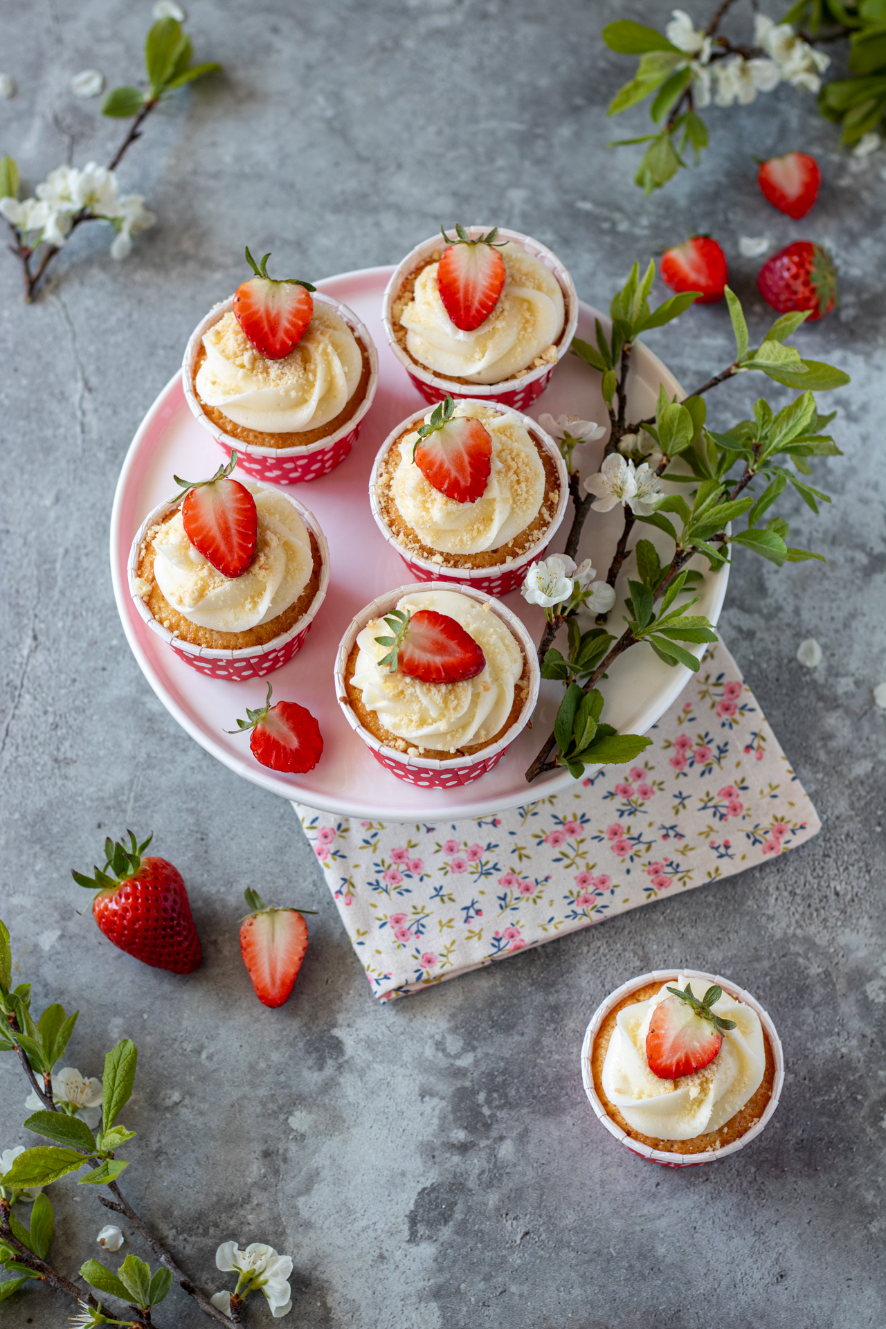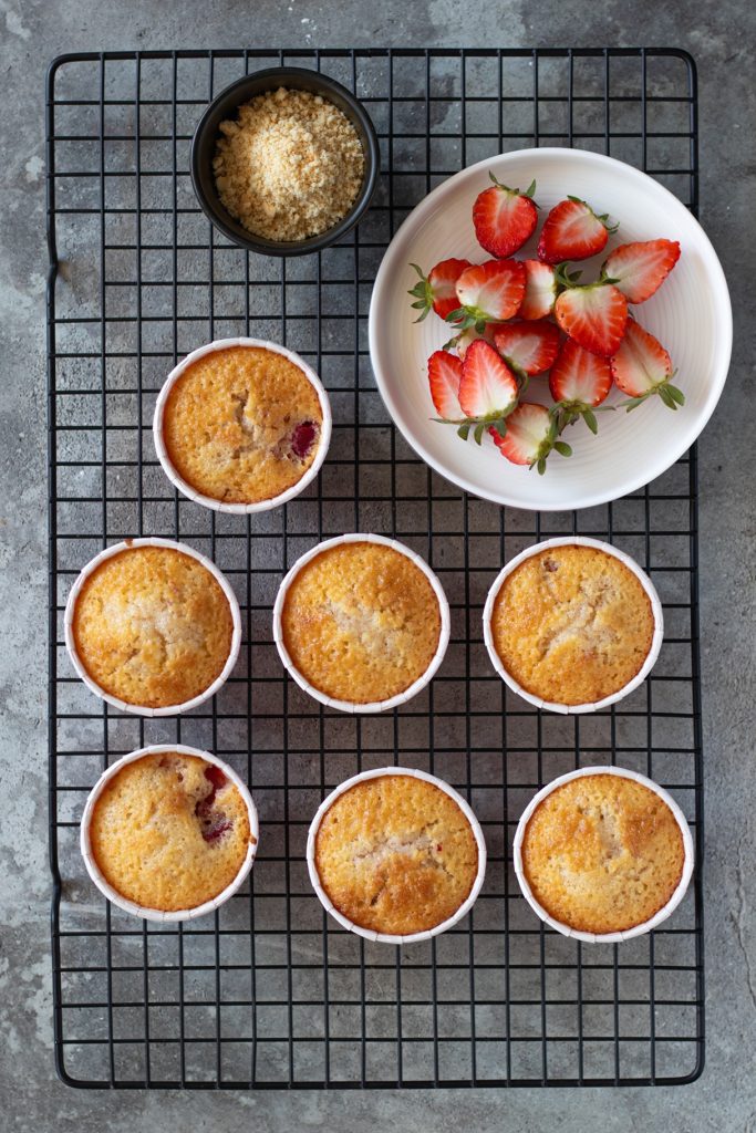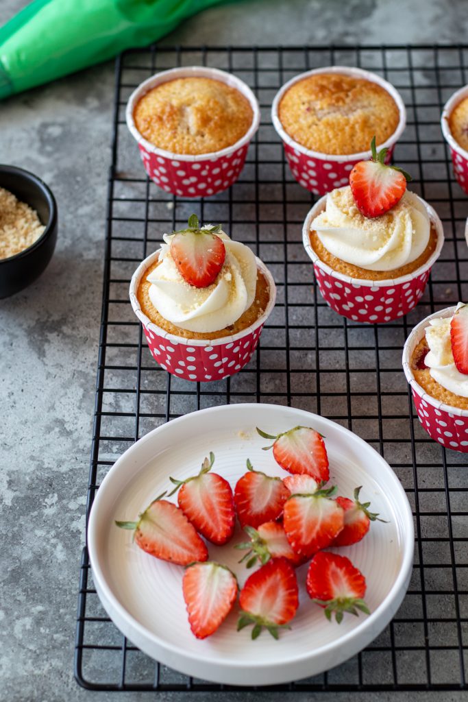 - Lavate e asciugate le fragole poi tagliatele a metà. Spolverate i cupcake con i biscotti sbriciolati e decorate con le fragole. Conservateli in frigorifero fino al momento di servire.