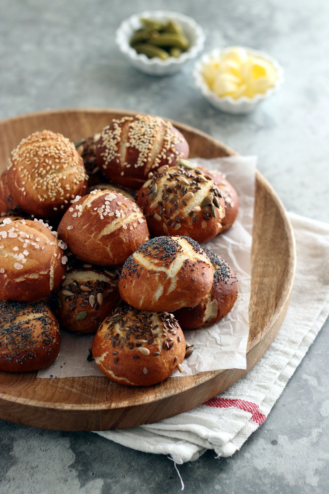 Ingredienti per la bollitura: 1,5 L di acqua, 80 g di bicarbonato, 1/2 cucchiaino di sale fino. Per decorare: semi di zucca, semi di sesamo, semi di papavero, sale grosso.
